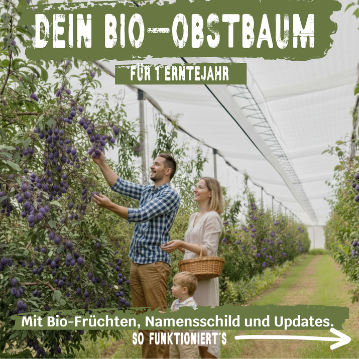 • 🍎Du bekommst echtes Bio-Obst, zum Selbstpflücken oder bequem zu dir nach Hause versendet, regelmäßige Updates & ein persönliches Namensschild.